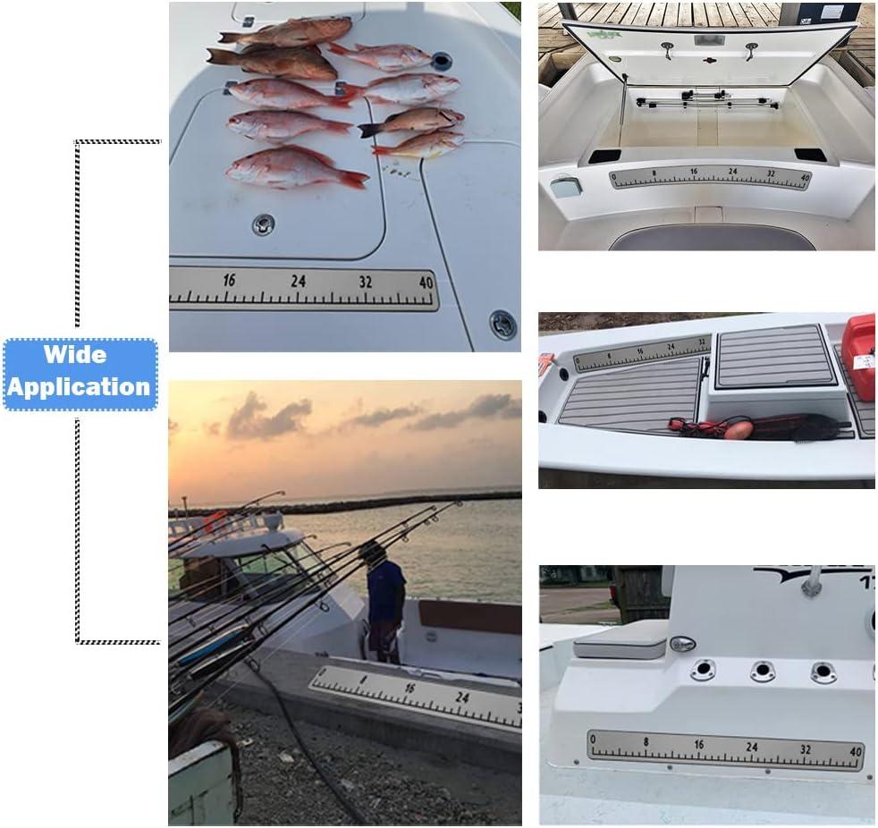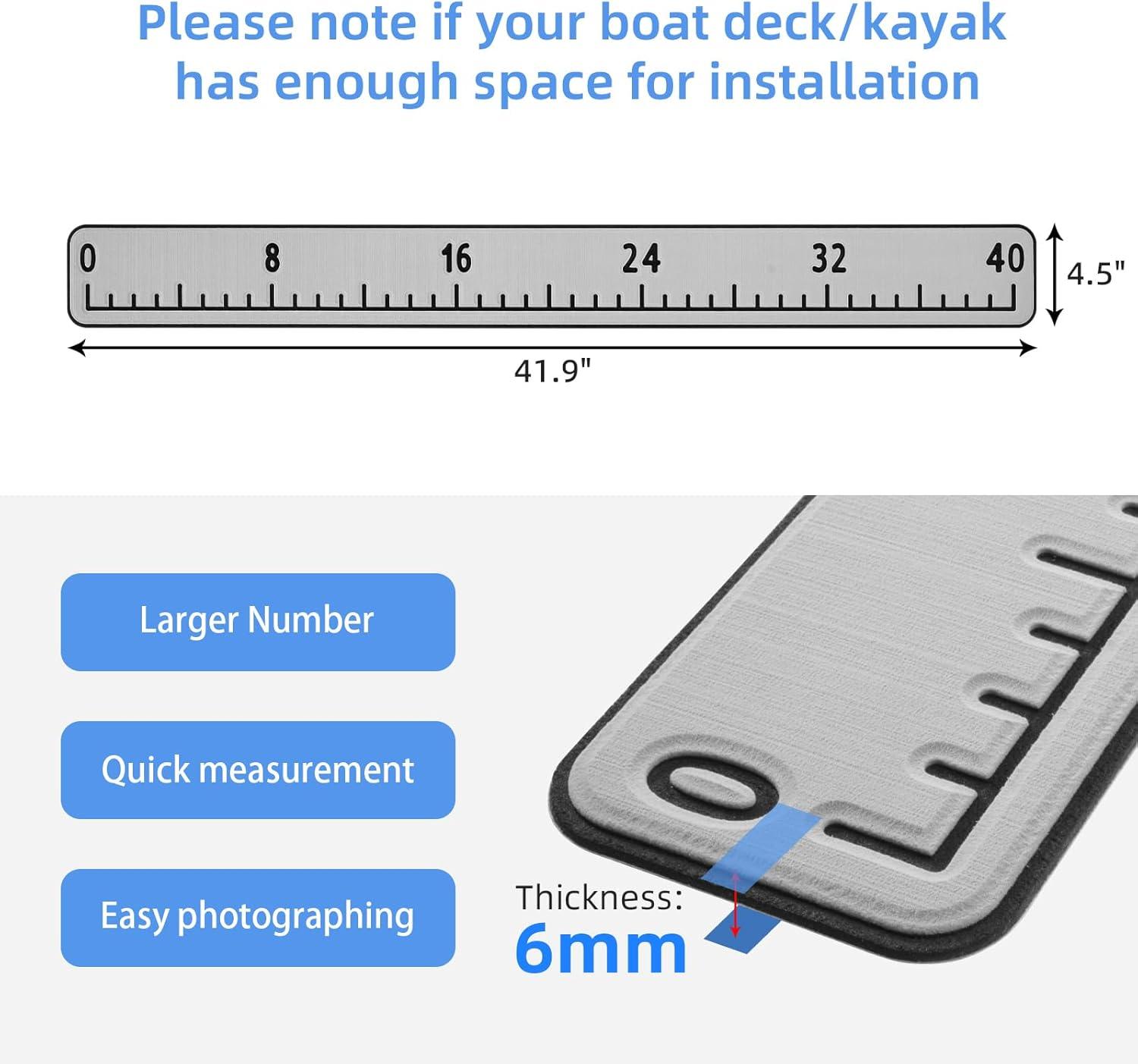 Dimensions of Fish Ruler : Overall dimensions: 41.9″ x 4.5″. The measured value can reach 40''. It can measure your maximum catch. Brushed texture non-skid surface to help measure slippery fish. The overall size of the fish ruler is relatively large. Please ensure that your boat or you kayak has sufficient space for installation and use